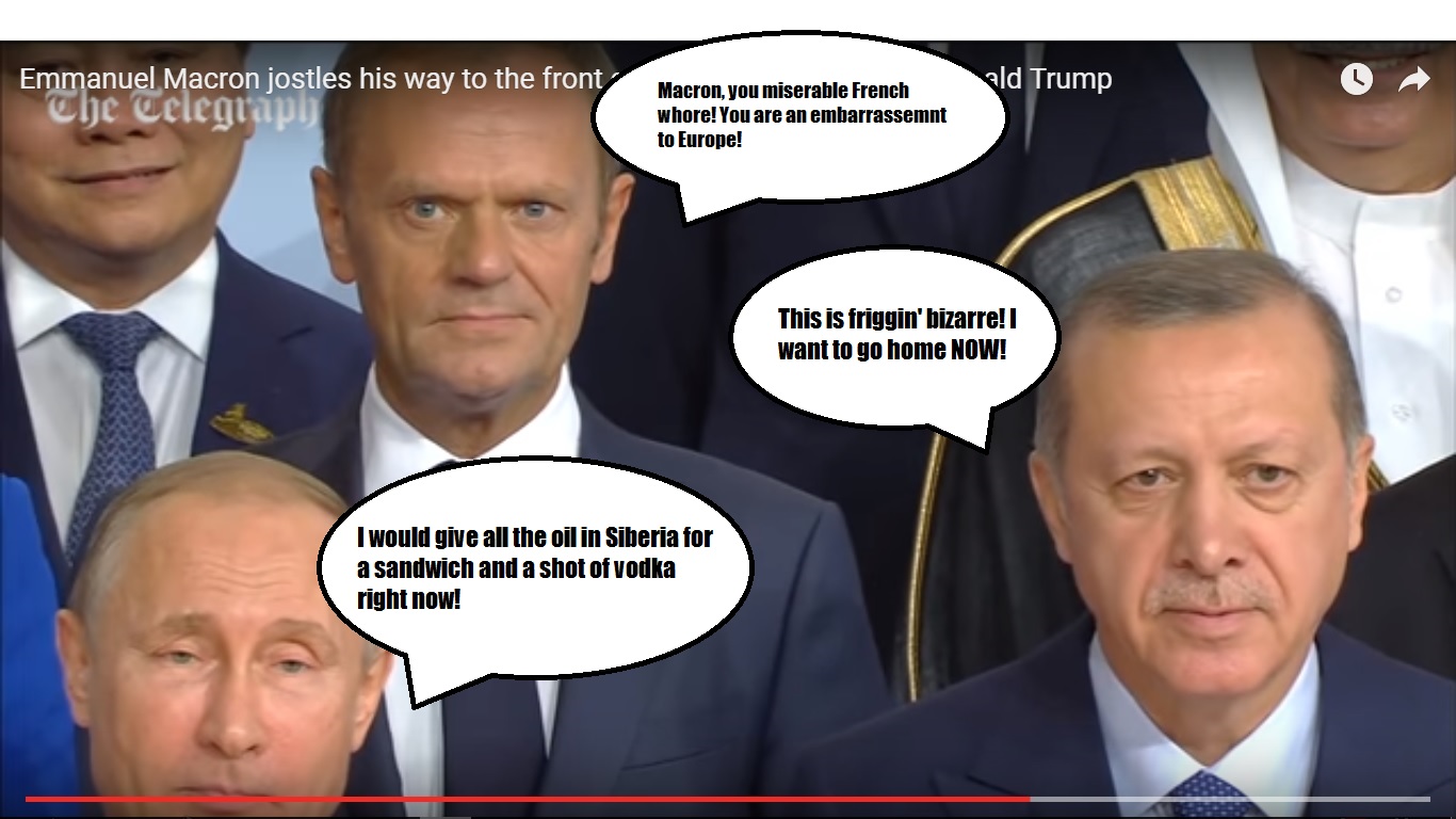 Actually, and because we abhor fake news, I believe Macron is simply following the directions of the guy with his back to us, who is placing the group. But, you have to admit, the optics are terrible for the proud Frenchman.