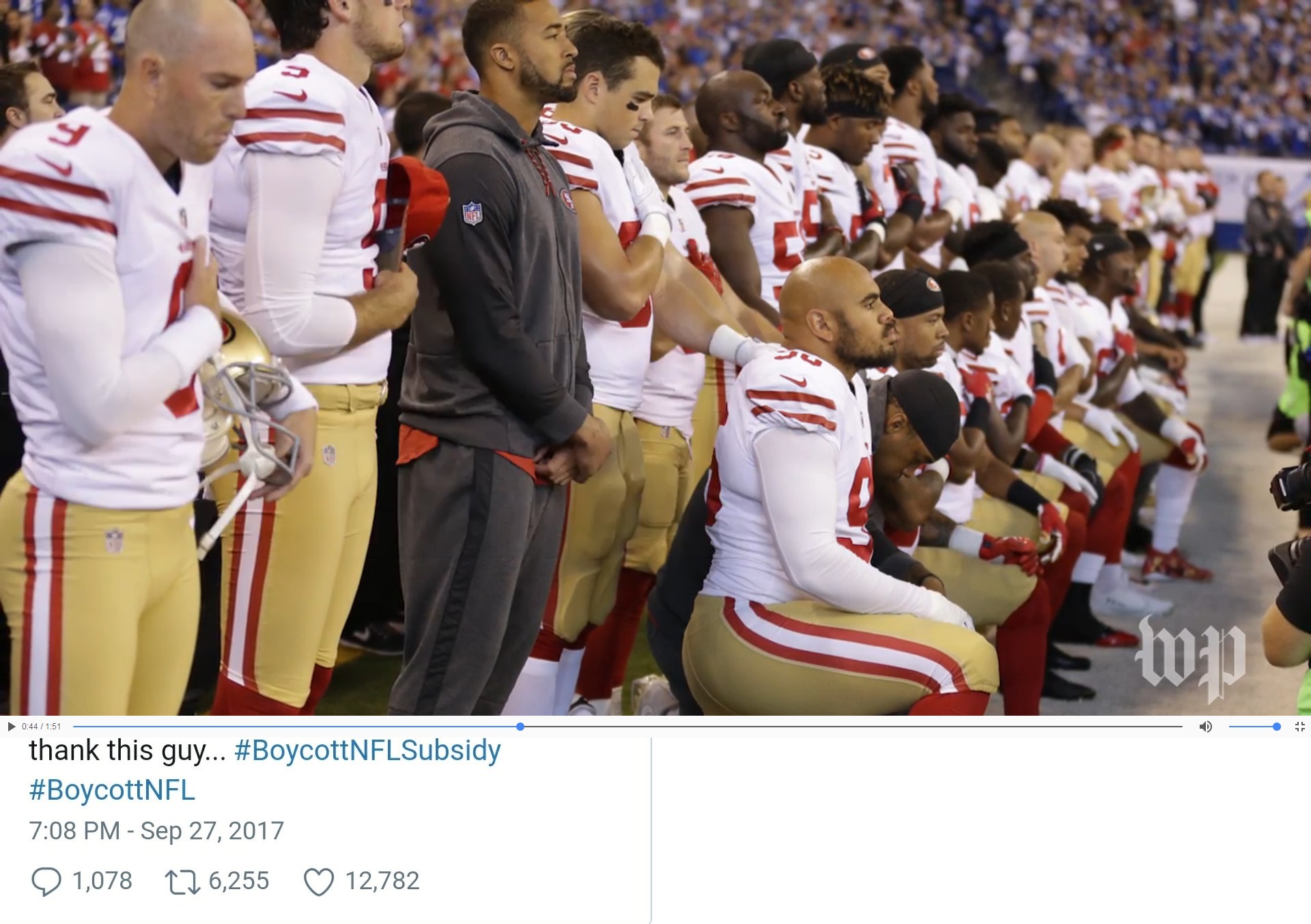 Jones and the rest of the team kneeled arm-in-arm before the national anthem before a game against the Arizona Cardinals two weeks ago, days after President Trump reignited the anthem-protest controversy.