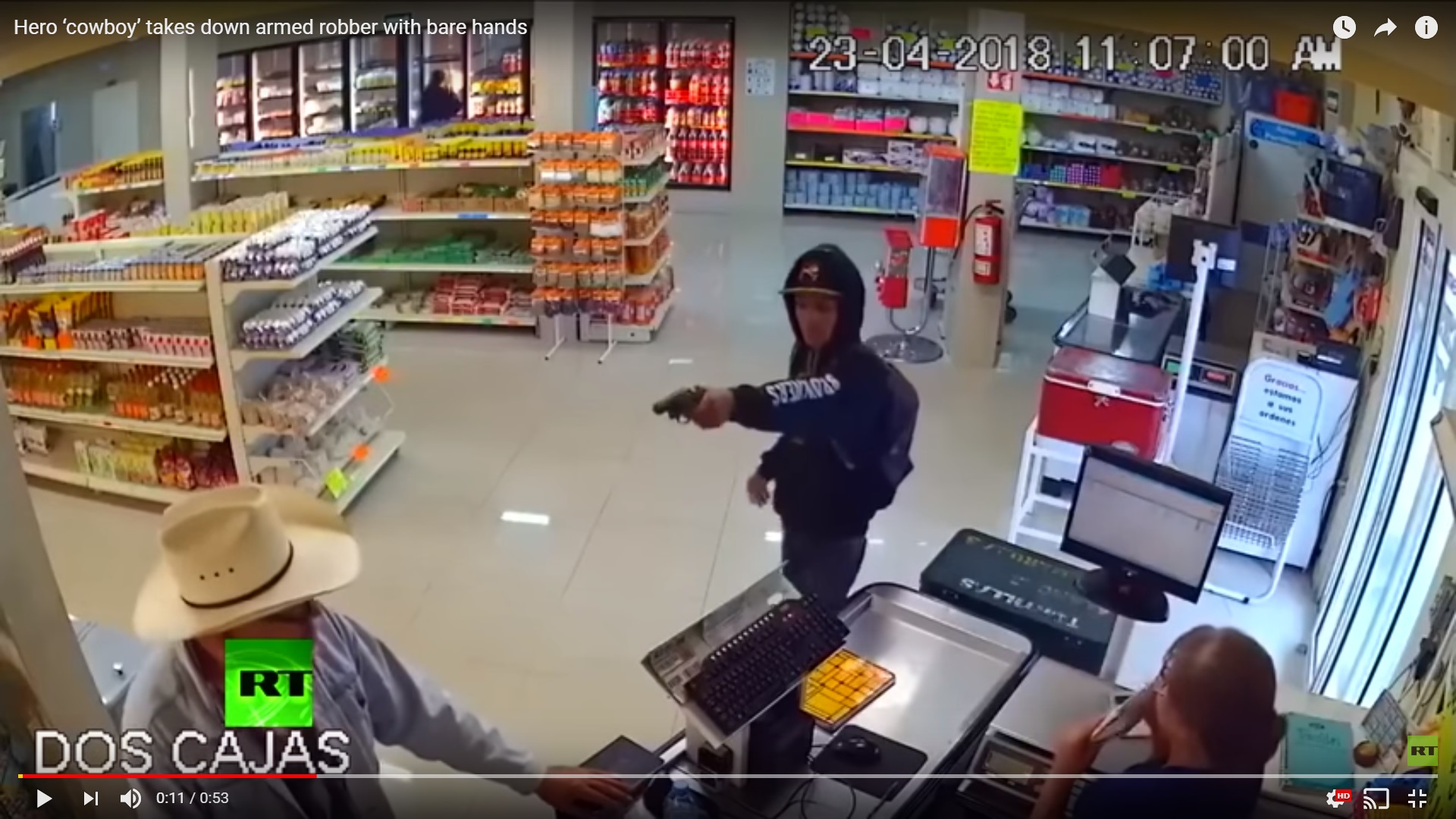 Our story ends when karma arrives in the form of uniformed police officers pointing their weapons through the store window at our hapless gangster who is eager to obey their commands to assume the arrest position, face down, on the shop floor.