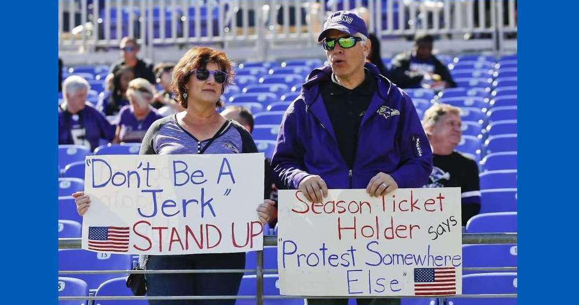 Except the powers that be in the NFL and the team owners, like all liberals, simply do not get it. They see no reason to stand for the national anthem and praise those who defy convention and kneel like $10 hookers or sit on their privileged asses while the fans, who by the way, are responsible for the millions of dollars those players make each year for playing what is more and more looking like a silly game, stand in respect for our flag, our country, our troops, our veterans, and law enforcement, while suffering the insult of the entitled crybaby millionaires.