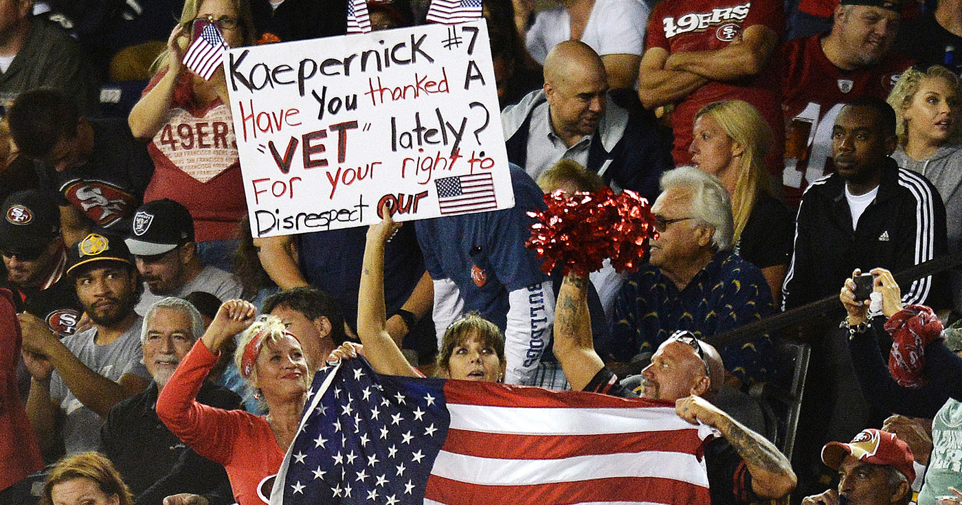 American professional football fans are as loyal a lot as you will find on the planet. Generally, they are hardworking and patriotic, passionate about their families, their football, and their flag. Many served to defend and protect that flag, the flag that multimillionaire losers like Kaepernick so thoughtlessly shit on every Sunday.
