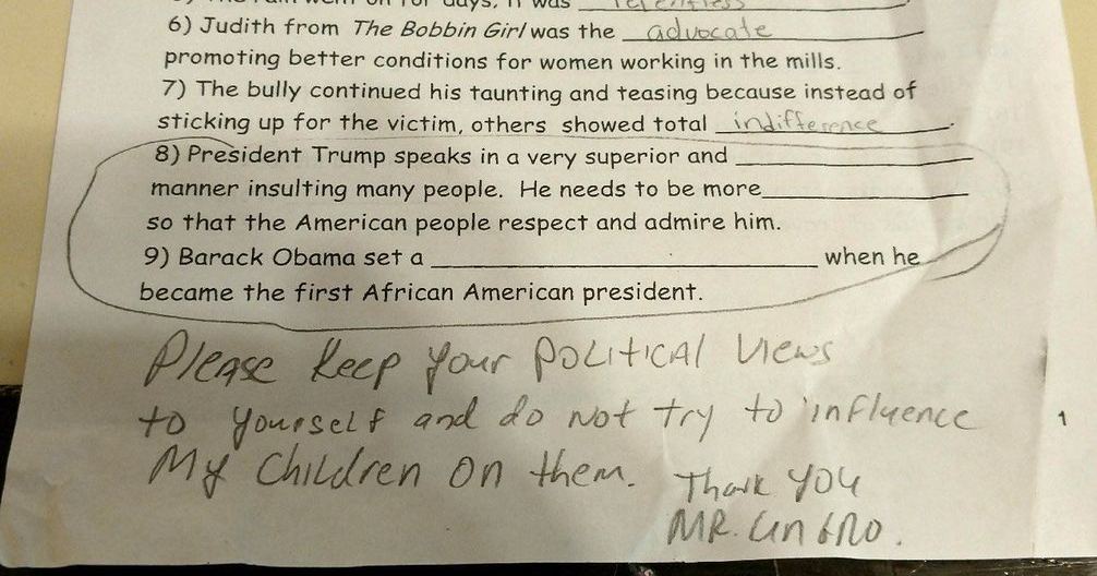 Teacher puts anti-Trump comment into homework assignment, father of student protests, teacher reprimanded, America wins!