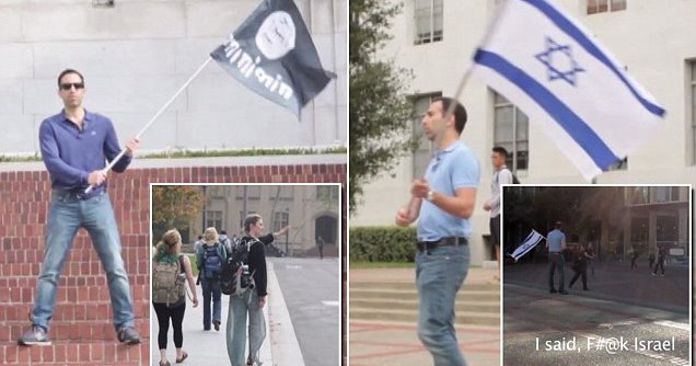 Amazing video of Berkeley students supporting a guy waving an ISIS flag, but then going crazy when the same guy waves the Israeli flag