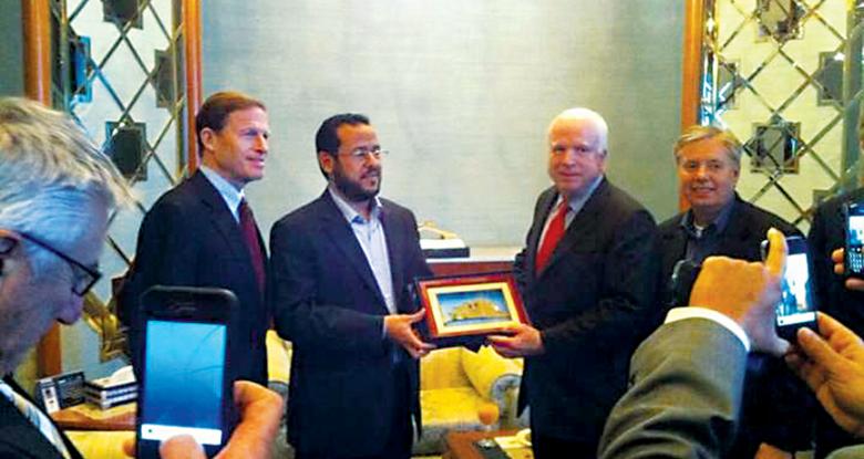 The photo, above, shows John McCain shaking hands with and presenting a gift to the leader of the terrorist organization…