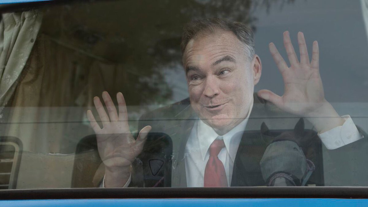 Photo, above: Tim Kaine, apparently flirting with a horse (add your own punchline) from the back of a bus. Kaine…