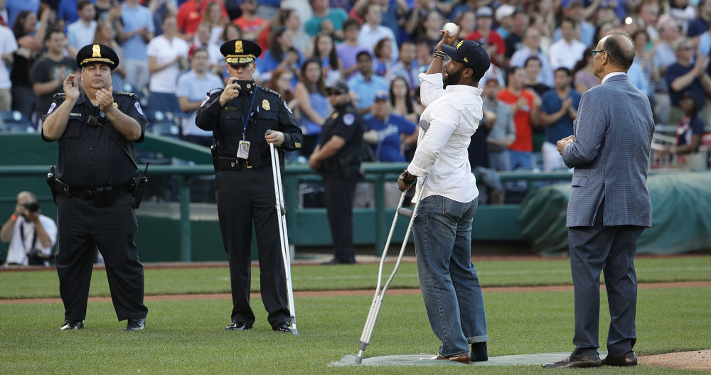 VIDEO: Powerful moment as wounded Capitol Police Officer David Bailey throws out first pitch at Congressional Baseball Game