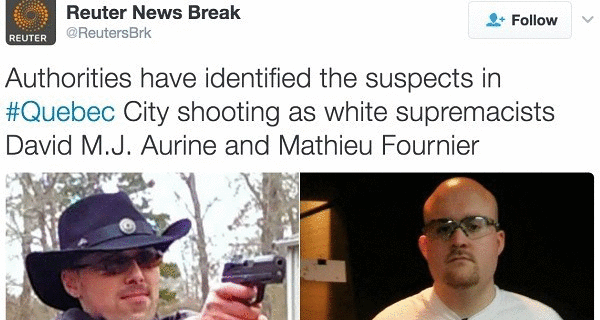 FAKE NEWS ALERT! Reuters declares that the Quebec mosque killers were “white supremacists.” I guess they forgot about or ignored the killers shouting “Allahu akbar”